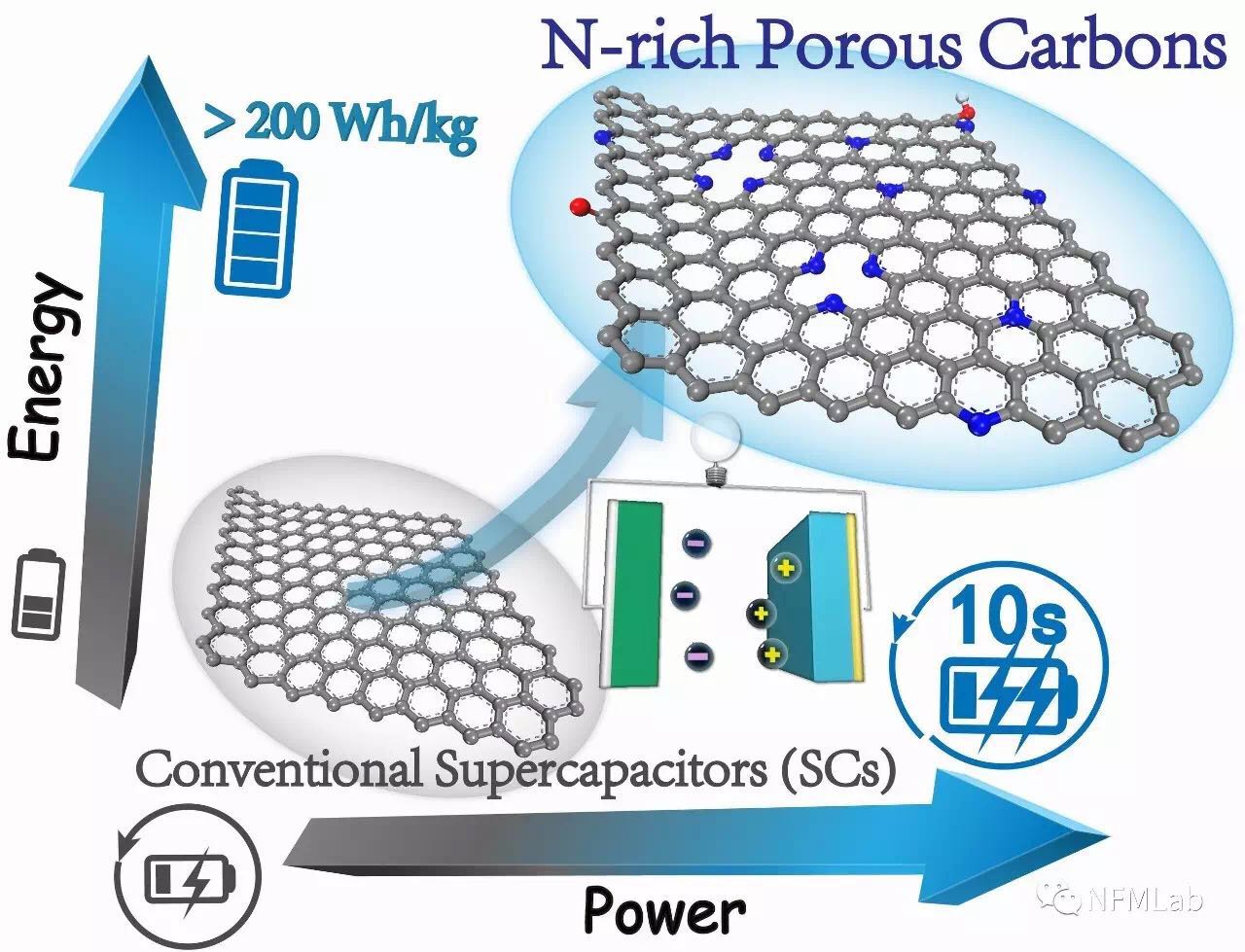 正因為超級電容器具有快速充放電、長循環壽命和高安全性等優點,它已成為能源儲存體系的研究重點,但一直難以突破其較低能量密度的瓶頸。氮摻雜能夠對碳材料的導電性、孔結構和電化學活性位點進行調節,因而氮摻雜碳材料被認為是很有前景的超級電容器電極材料。尤其是近兩年來,富氮多孔碳材料在超級電容器領域取得了突破性進展,在保證大功率的前提下獲得可媲美電池級別的高比能量。