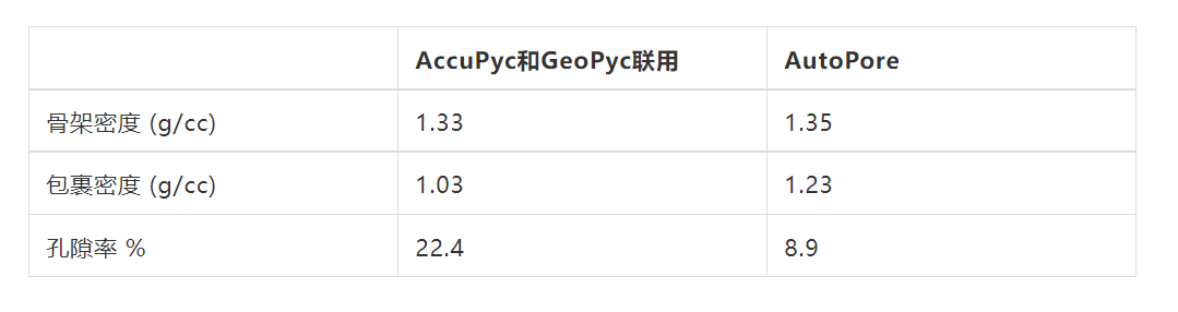 無論是氣體置換或者壓汞法,都能夠進入片劑表面的孔隙,因此兩種方法得到的骨架密度接近。由于GeoPyc包裹密度的測試中,包裹介質DryFlo的粒徑遠大于片劑的孔徑,所以包裹密度值與AutoPore測得的值有差異。對于壓汞法,即使沒有施加壓力,汞也能進入這些孔隙,因此包裹密度值較大。而包裹密度的差異,也得到了不同的孔隙率結果。