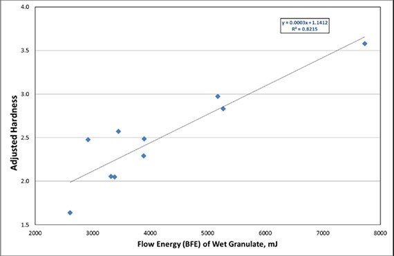 分析壓片數(shù)據(jù)(圖2)可知,濕顆粒BFE與調(diào)節(jié)硬度之間存在較強的相關(guān)性。因此,結(jié)合兩項研究可知如何控制關(guān)鍵工藝參數(shù)來得到片劑的CQA。