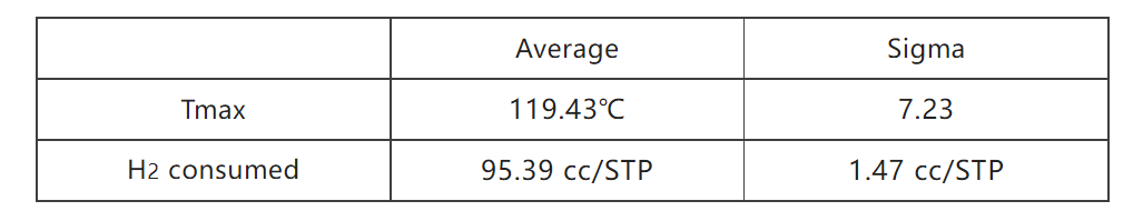 分別使用兩臺AutoChem化學吸附儀對上述氧化銀進行總計36次TPR測試,所得的平均Tmax和H2消耗量統計結果如下表: