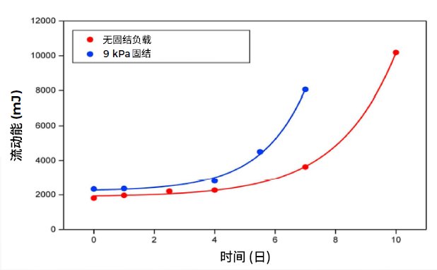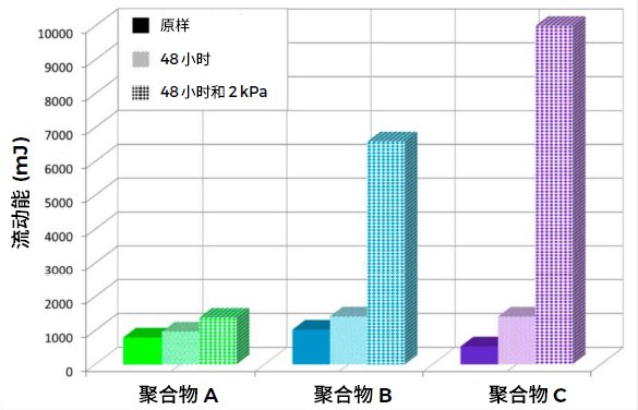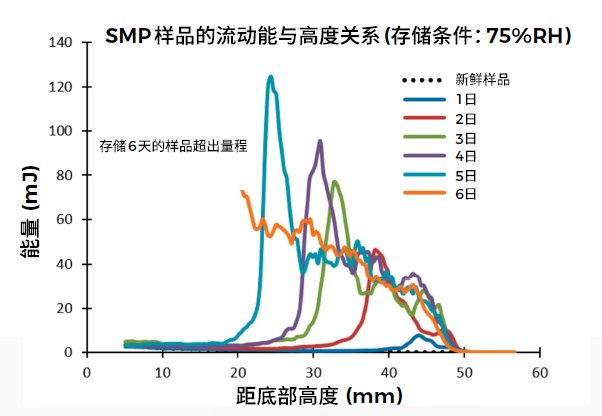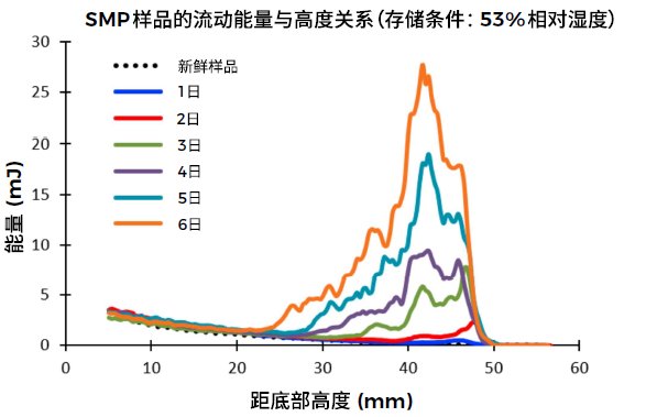 在研究過程中,該濕度水平已足夠滲透至容器底部,可通過六天存儲后的樣品的測試結果證實,此時樣品已完全固化,無法測量流動能。