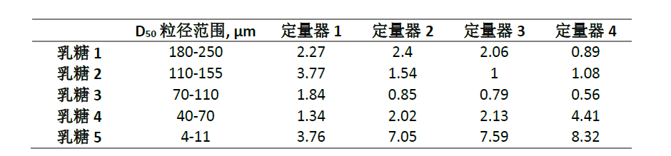 通過(guò)定量器(Lab Dosator, 3P Innovation, Warwick, UK)對(duì)五種不同粒徑分布的乳糖粉體分配劑量,其中定量器選用四種不同尺寸的出口(從定量器1到定量器4,依次減小)。定量的目標(biāo)質(zhì)量為50mg,理論相對(duì)標(biāo)準(zhǔn)偏差RSD<2%。每種乳糖與定量器的組合RSD值如表1中所示。