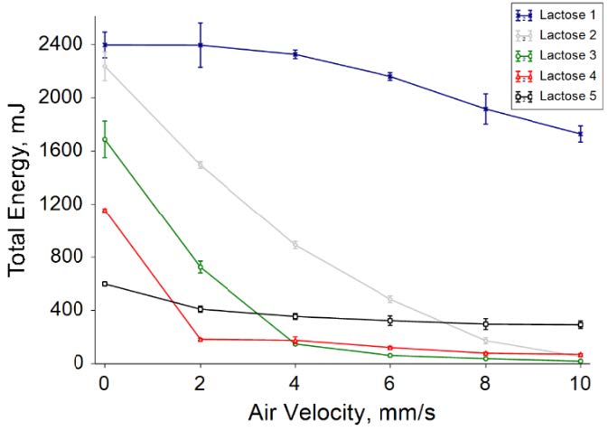 圖1和表2所示數(shù)據(jù)表明,乳糖1對(duì)充氣最不敏感,可能是乳糖本身透氣性較好。乳糖5的曲線說(shuō)明粉體的粘性較強(qiáng),在10 mm/s的氣流速度下仍具有較高的流動(dòng)能。然而,乳糖2到乳糖4的粘結(jié)程度都低得多。乳糖1和乳糖5的AE2差異最大,下文將進(jìn)一步分析。