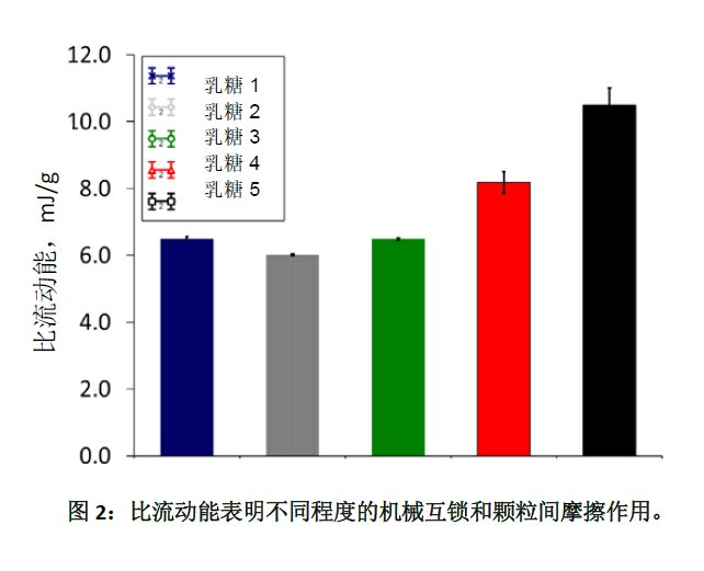 圖2列出了五種乳糖粉體的比流動(dòng)能結(jié)果。其中乳糖5的比流動(dòng)能最大,乳糖2的比流動(dòng)能最小。