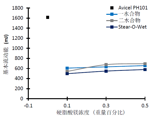 所有潤滑劑都能顯著降低基質的BFE,說明在動態、強制流動的工藝(例如,送料和混合)中流動性有所提升,所有基質中Inhalac 230對潤滑劑最敏感,而甘露醇最不敏感。以Avicel PH101為基質,少量潤滑劑(0.1%)就能顯著改善動態流動性,但進一步增大濃度并不會提高流動性。