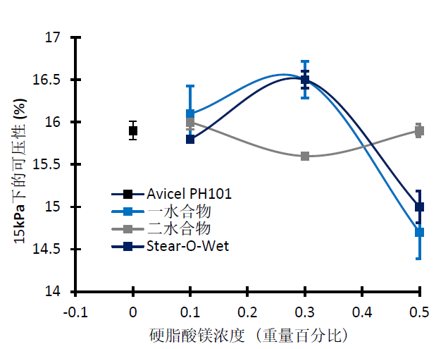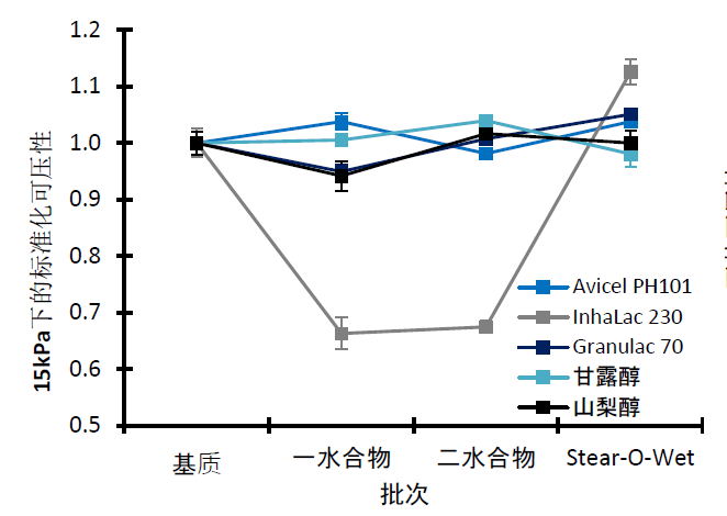 在Inhalac 230中添加潤滑劑導致可壓性顯著變化。一水合物和二水合物的可壓性降低,但添加Stear-O-Wet時可壓性升高,說明不同的潤滑劑以不同方式作用于基質。對于其它的基質和潤滑劑組合,可壓性僅觀察到十分有限的變化。以Avicel PH101為例,隨著潤滑劑含量的增加或減少,基質可壓性的變化響應各異。在低濃度的潤滑劑下,一水合物和Stear-O-wet的可壓性增大,并隨著濃度的增大又降低。二水合物的響應趨勢則相反。較高的可壓性通常表示粉體具有粘性,因此它對壓實操作(例如,壓片)有負面作用。