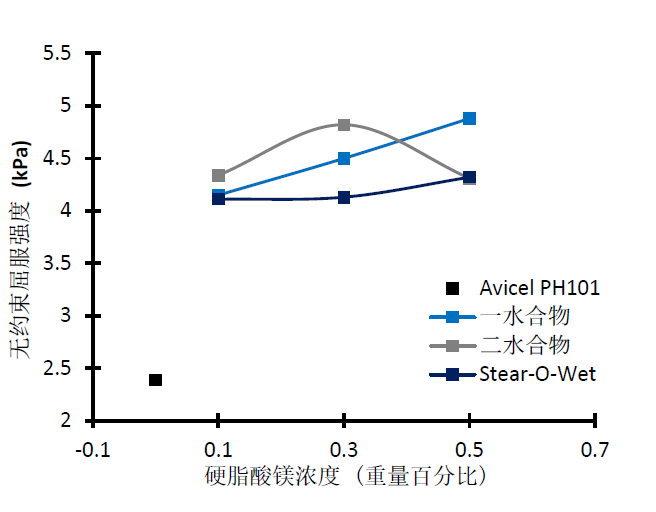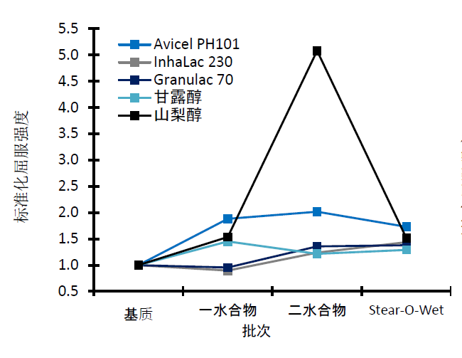 二水合物和Stear-O-Wet通常會增大基質的無約束屈服強度(UYS)(對于山梨醇/二水合物混合物十分顯著),說明這些組合后的混合物在儲存后的初始流動更加困難 。這也是為什么在加工接近結束時,而不是在料斗內添加潤滑劑的原因,否則會產生反效果。一水合物對UYS的影響取決于基質。Granulac 70和Inhalac 230與其它三種基質相比,UYS都降低。而當Avicel PH101作為基質時,UYS的增大不僅取決于潤滑劑的類型,還取決于其濃度。
